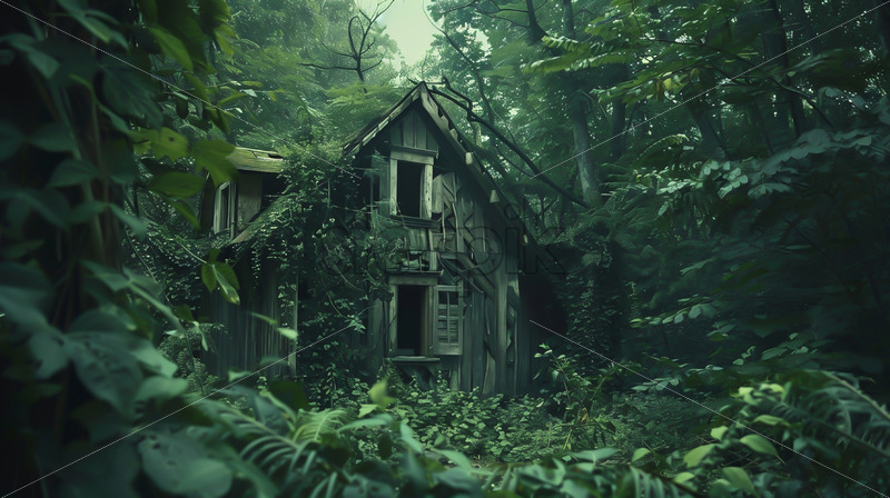 An ancient, moss-covered ruin peeking through the thick vegetation