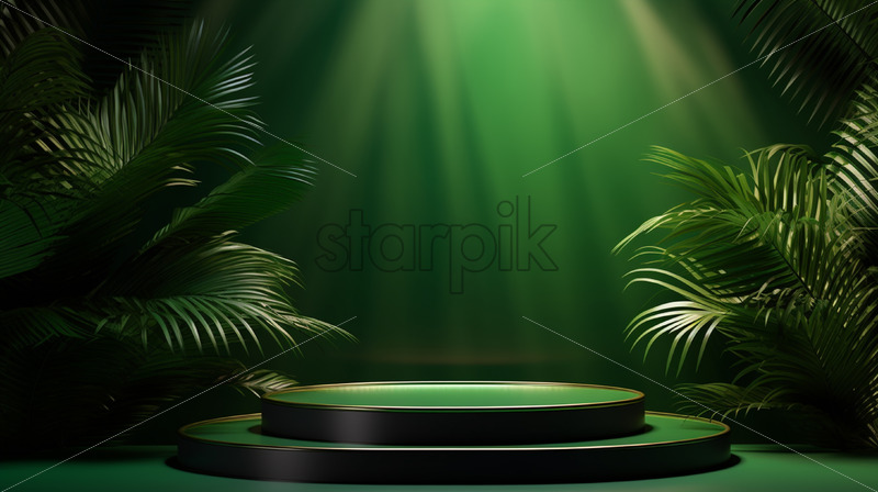 An abstract green podium with palm leaves