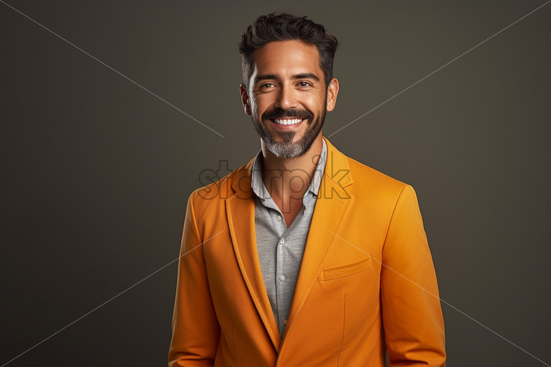 An adult model smiling pleasantly, on an orange background, dressed in orange clothes