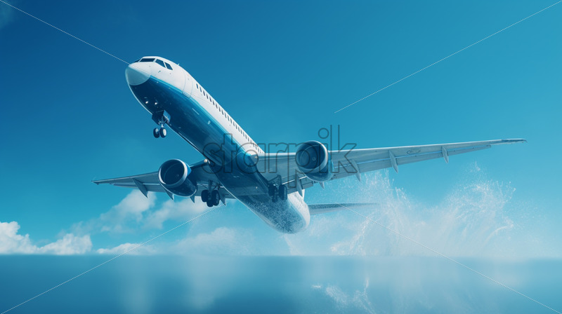 An airplane airplane flying in the air against the background of a water spray and blue sky