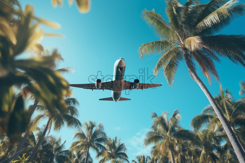 An airplane flying over some palm trees