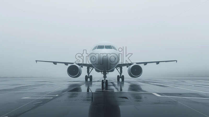 An airplane on the runway, gloomy weather