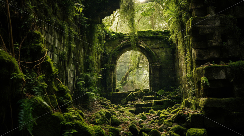 An ancient, moss-covered ruin peeking through the thick vegetation