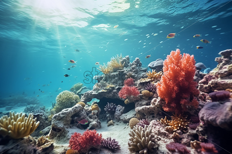Bottom of the Mediterranean sea. Sunlight, swimming fishes