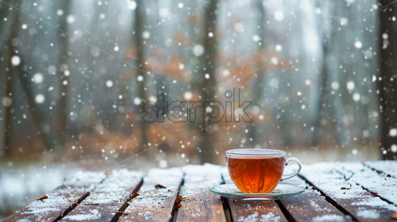 Home » Shop » Uncategorised » An aromatic cup of tea in winter on a table in the forest