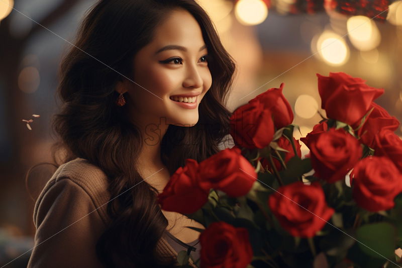 Portrait of gorgeous and beautiful caucasian woman in casual clothes looking at extensive landscape and standing on the observation deck with high mountains bordering with expanse of water in the background. Lake Como, Italy