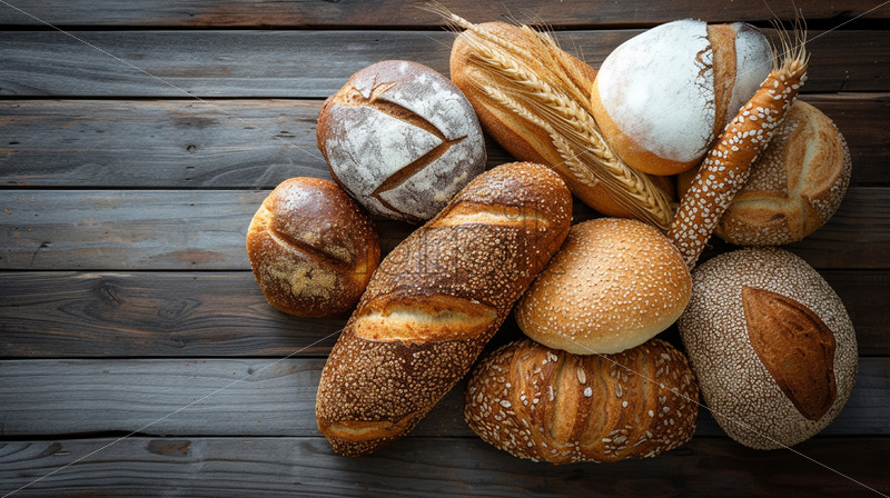 An assortment of bread products on a wooden table
