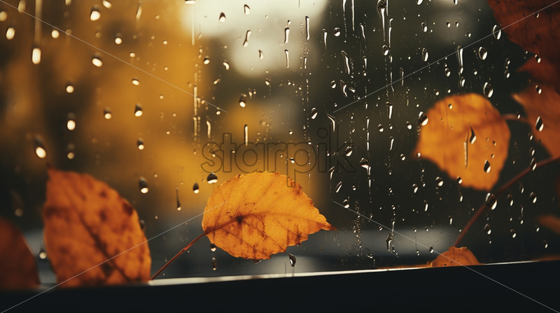 Some autumn yellow leaves, in a rainy day with water drops on them