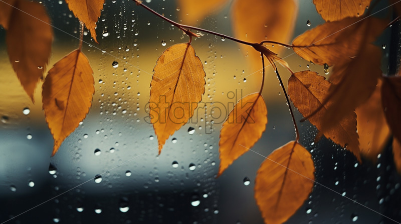 An autumn scene with rain and leaves on the window
