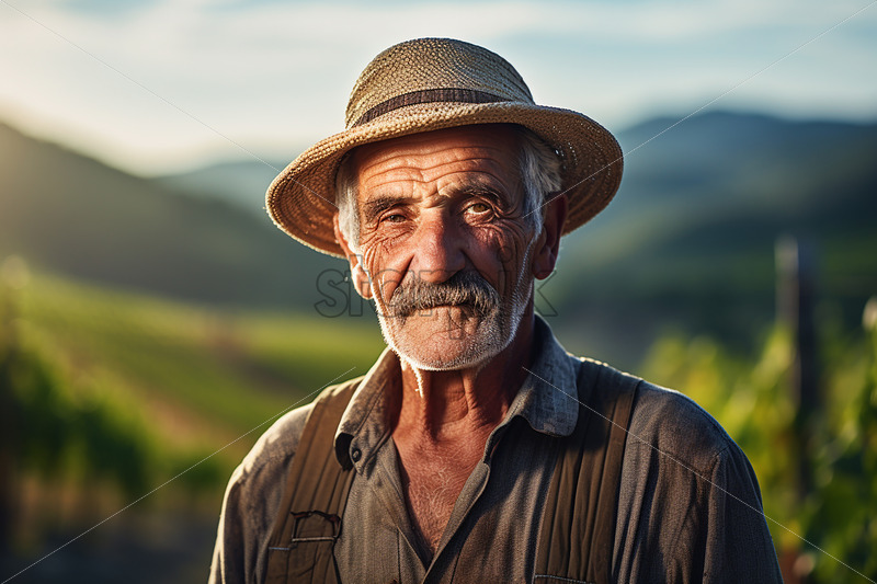 An elderly farmer on the background of a field with vines