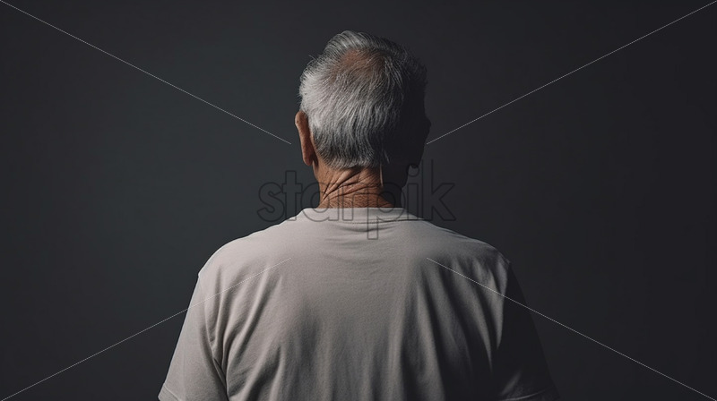 An elderly man with his back in a t-shirt