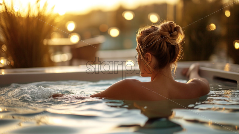 Home » Shop » Uncategorised » An elegant young lady lounging in a chic outdoor spa pool, with soft lighting creating a tranquil ambiance