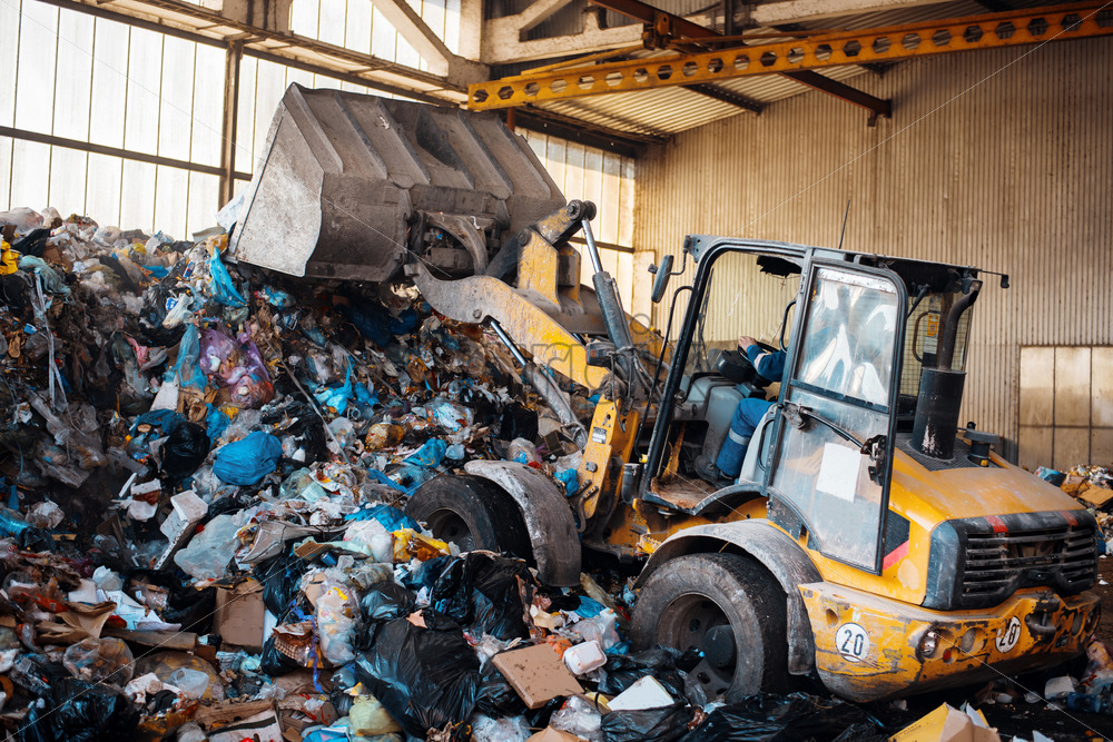 CHISINAU, MOLDOVA – MARCH, 2023: An excavator carries a heap of garbage at waste sorting plant
