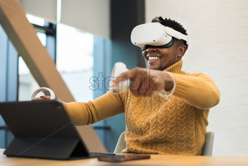 An excited black man exploring virtual reality using VR glasses and controllers in an office, tablet on the table