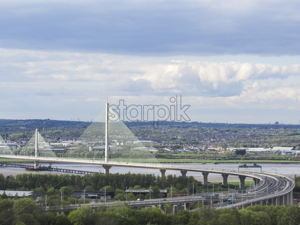 An extradosed bridge in Warrington, Cheshire, situated at the North West of England. Shot during midday with som clouds in the sky. Lots of greenfields with trees and urban style houses