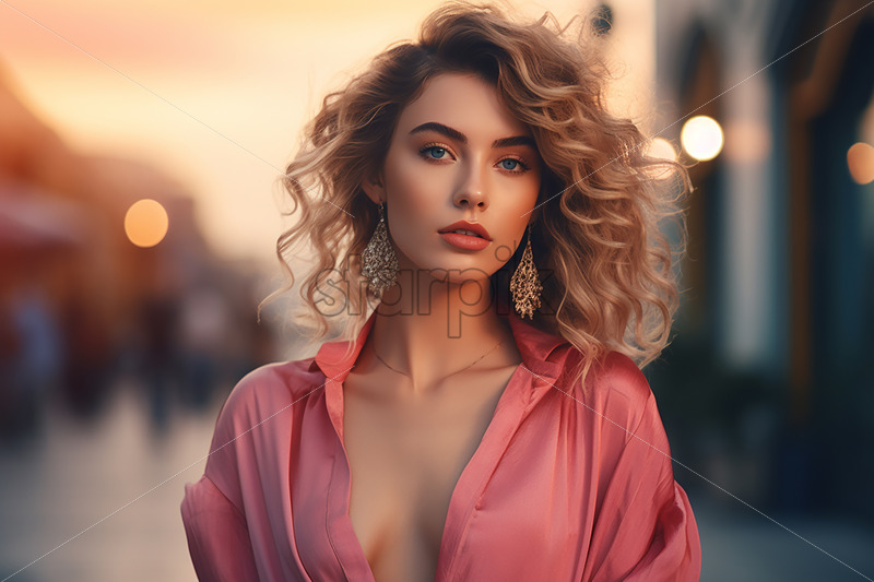Portrait of a young woman with curly hair and blue eyes in black medical mask with water on the background