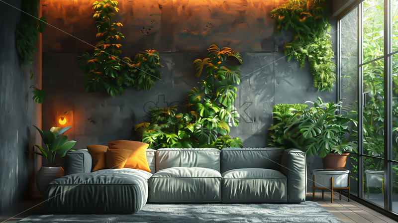 An indoor photograph capturing the modern charm of a living room featuring a gray sofa set, a plant in a vase, wooden chair, warm lighting, and plants beside the stair base, complemented by glass panels, bathed in the morning sunlight … Read More