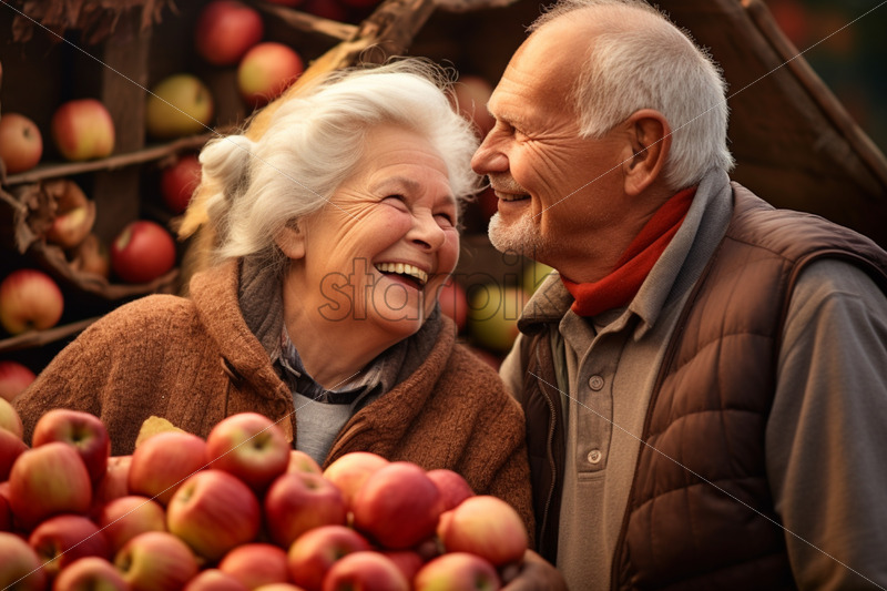 Home » Shop » AI Illustration » An old couple collecting apples harvest fall season beautiful