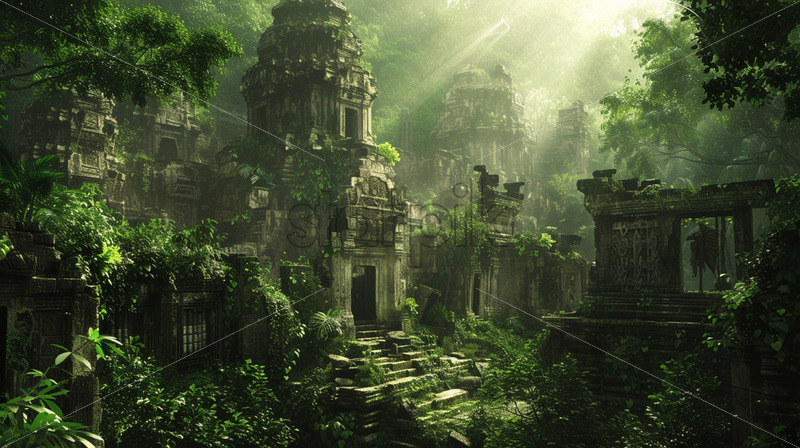 An ancient, moss-covered ruin peeking through the thick vegetation