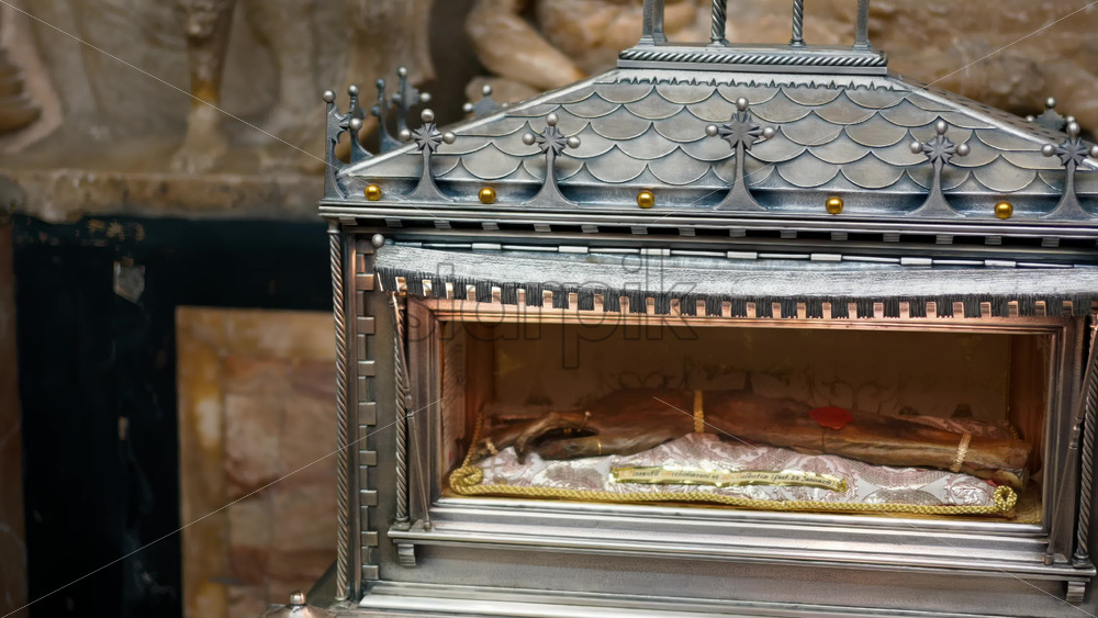 An ornate silver reliquary case displaying a preserved limb wrapped in textiles at a museum in Valencia, Spain Royalty Free Stock Video Footage