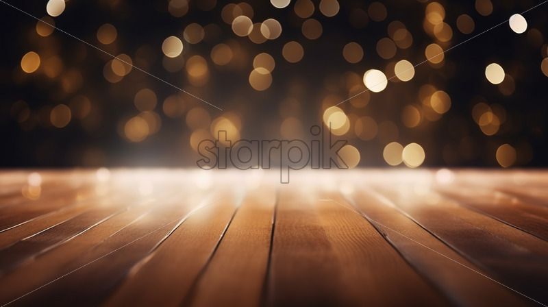 An wood empty floor with bokeh light effect in the background