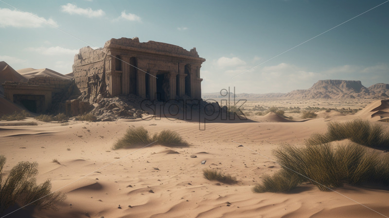 Ancient ruins partially buried in the shifting sands of a remote desert