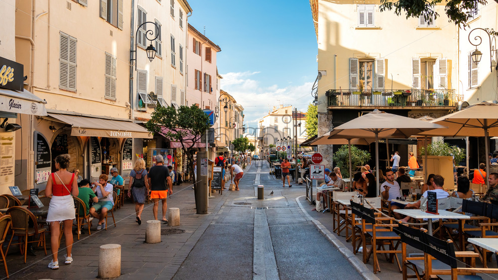 ANTIBES, FRANCE – AUGUST 30, 2021: Street scape of the town. Traditional buildings, people, cafes