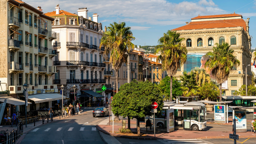 ANTIBES, FRANCE – AUGUST 31, 2021: Street scape of the town. Traditional buildings, people, greenery and cafes