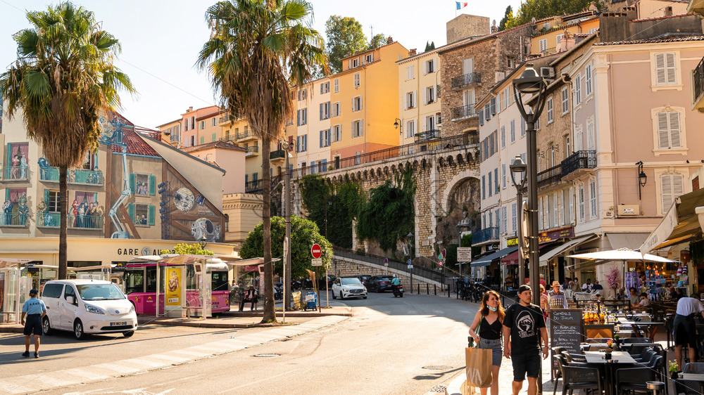 ANTIBES, FRANCE – AUGUST 31, 2021: Street scape of the town. Traditional buildings, people, greenery and cafes