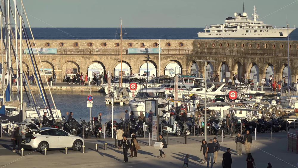Antibes, France – July 2, 2025: Scenic coastal view featuring a luxury yacht, historic stone arches, and a colourful carousel Royalty Free Stock Video Footage