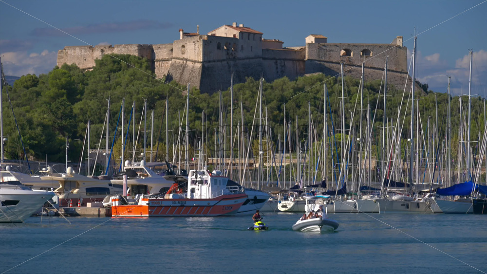 Home » Shop » 1 Video » Video – Antibes, France – June 7, 2025: Multiple white boats docked in the Port Vauban with the Fort Carre on the background in daylight