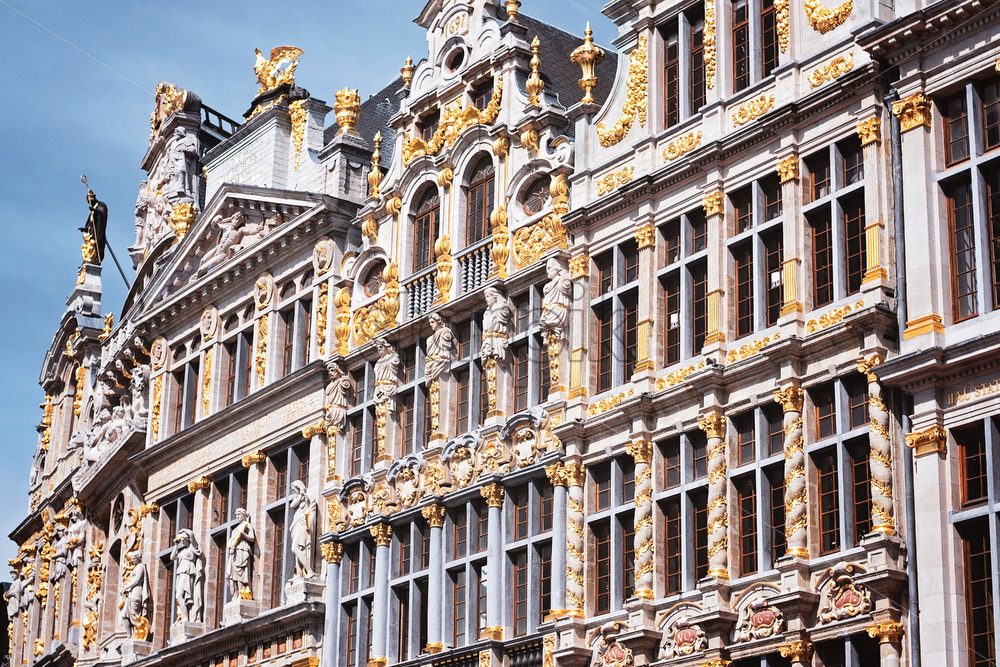 Apartments decorated with gold ornaments in The Grand Place, Brussels, Belgium. Close up shot