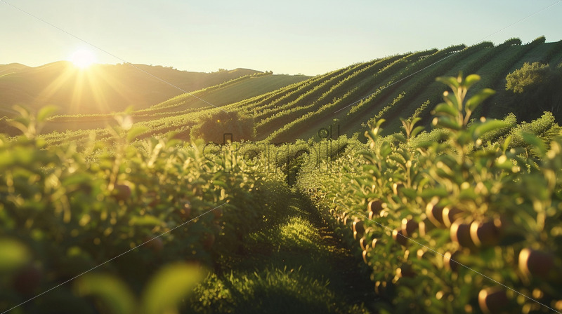 The sun peaking through different green trees in an orchard at sunset Royalty Free Stock Video Footage