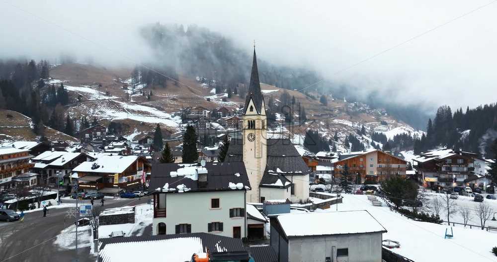 Corvara in Badia, Italy – January 12, 2025: Aerial drone view of the Corvara village covered in snow, in South Tyrol, Dolomites, in northern Italy Royalty Free Stock Video Footage