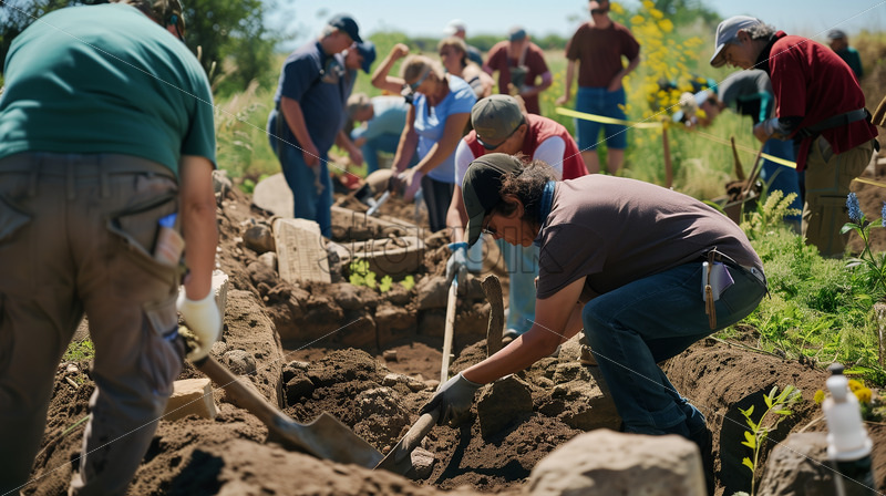 Enthusiasts participating in an archaeological dig, uncovering artifacts and exploring ancient civilizations with shovels, brushes, and trowels