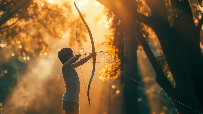 Bathed in dappled sunlight, a person stands poised with bow in hand, exuding tension and concentration as they prepare to release the arrow toward the distant target.