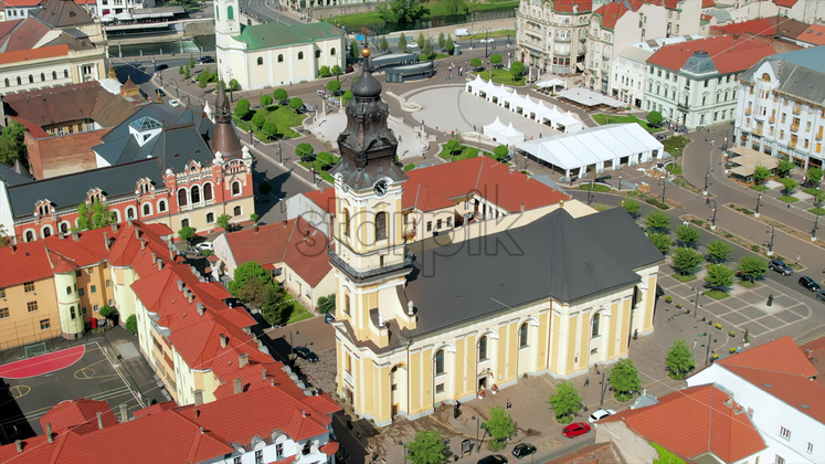 Areal drone view of the Cathedral of St. Nicholas in Oradea downtown, Romania. Unirii Square and historical buildings around Royalty Free Stock Video Footage