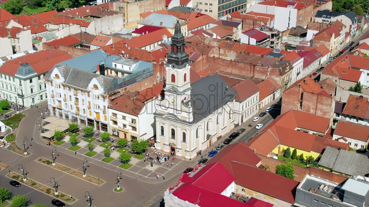 Areal drone view of the Moon Church in Oradea downtown, Romania. Historical buildings and walking people around Royalty Free Stock Video Footage
