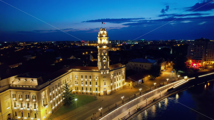 Areal drone view of the Town Hall in Oradea downtown at night, Romania. People on top on the City Hall Tower , illumination and Crisul Repede river Royalty Free Stock Video Footage