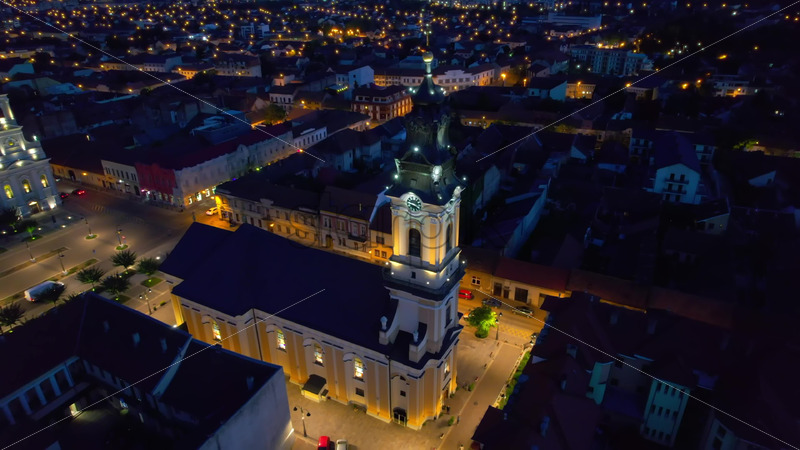 Areal drone view of the Unirii Square in Oradea downtown at night, Romania. Cathedral of St. Nicholas, illumination, multiple buildings around Royalty Free Stock Video Footage