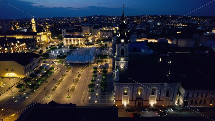 Areal drone view of the Unirii Square in Oradea downtown at night, Romania. Moon Church, Cathedral of St. Nicholas and other historical buildings, illumination Royalty Free Stock Video Footage
