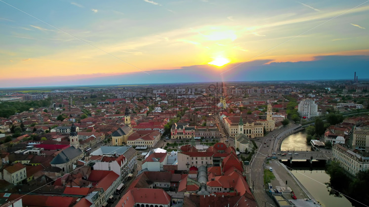 Areal drone view of the Unirii Square in Oradea downtown at sunset, Romania. King Ferdinand I statue, Saint Ladislaus Church, Town Hall and other historical buildings, walking people Royalty Free Stock Video Footage