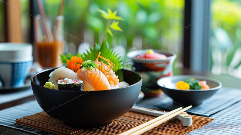 A visually pleasing photograph showcasing the artful presentation of Japanese sushi, featuring vinegared rice topped with an array of ingredients including fish, vegetables