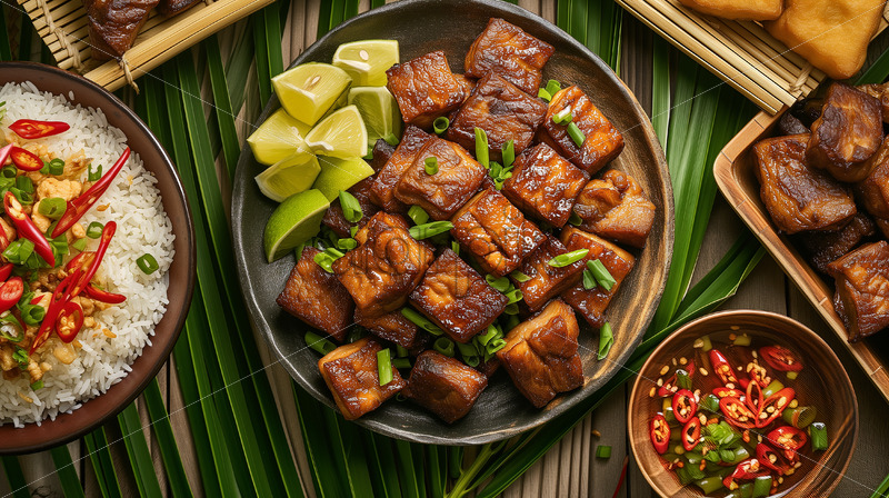 In a visually stunning presentation with professional lighting, this Filipino dish featuring tofu and pork with rice in a bowl showcases the artistry of culinary photography