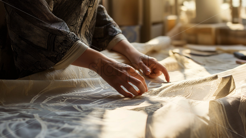 A creative textile designer in Providence, Rhode Island, USA, working on intricate fabric patterns in a design studio.