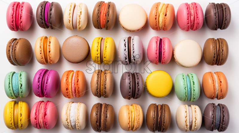 Colorful macarons and coffee cup, on wood table with Eiffel Tower on backgound