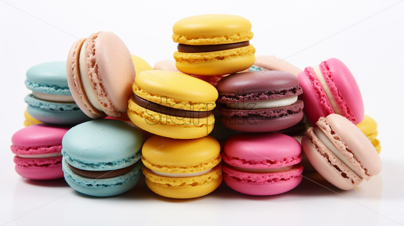 Colorful macarons and coffee cup, on wood table with Eiffel Tower on backgound