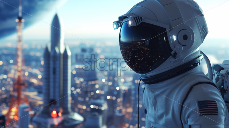 A man in futuristic VR glasses that simulate intergalactic space travel