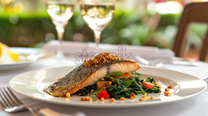 The pan-seared fillet is impeccably arranged on a bed of sautéed greens, accompanied by a drizzle of lemon myrtle sauce.