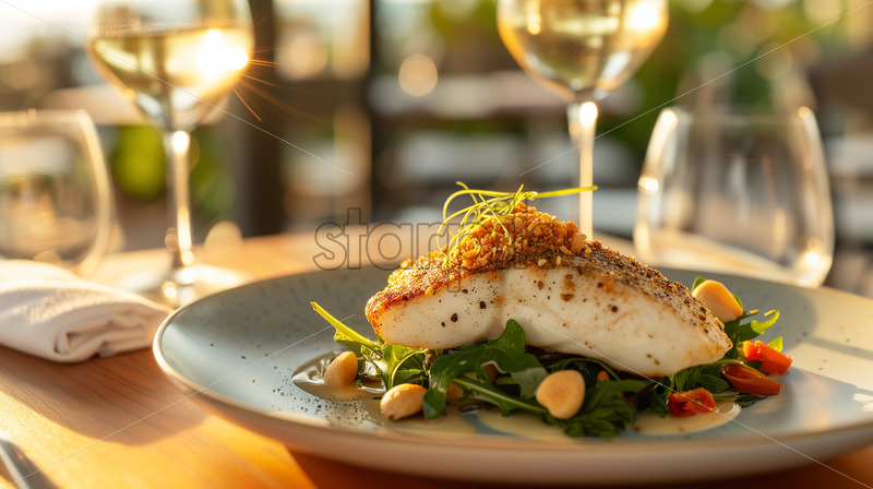 Barramundi adorned with a Macadamia Crust . The scene is elegantly propped with Australian wine glasses, native herbs, and modern dinnerware.
